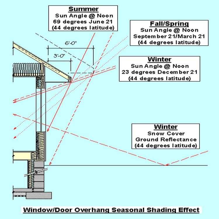 - extended roof overhangs sized for winter sun penetration and summer sun shading;