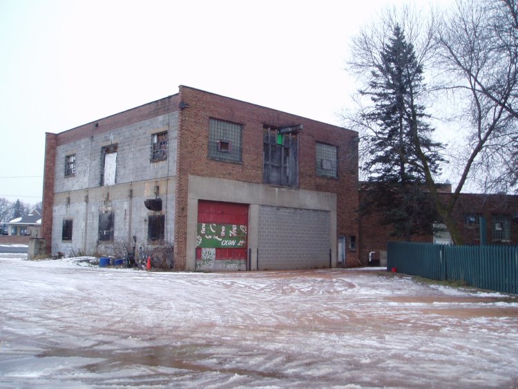 doors and service bays. The unfinished west facade faced a side parking area. The building sits prominently just